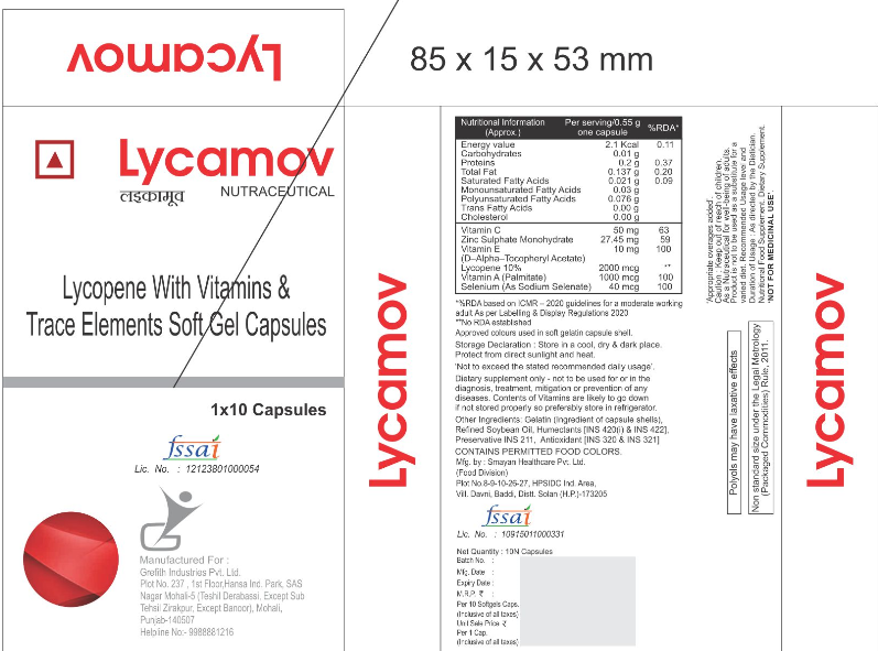 Energy Value – 2.14 kcal Carbohydrates – 0.01 g Proteins – 0.127 g Total Fat – 0.13 g Saturated Fatty Acids – 0.023 g Monounsaturated Fatty Acids – 0.036 g Polyunsaturated Fatty Acids – 0.070 g Trans Fatty Acids – 0.000 g Cholesterol – 0.0 mg Active Ingredients: Vitamin C – 40 mg (RDA 50%) Zinc Sulphate Monohydrate – 27.45 mg (providing 10 mg elemental Zinc) – RDA 63% Vitamin E (d-Alpha-Tocopheryl Acetate) – 10 mg – RDA 100% Lycopene (10%) – 2000 mcg Vitamin A (Palmitate) – 1000 mcg – RDA 100% Selenium (as Sodium Selenate) – 40 mcg – RDA 100%