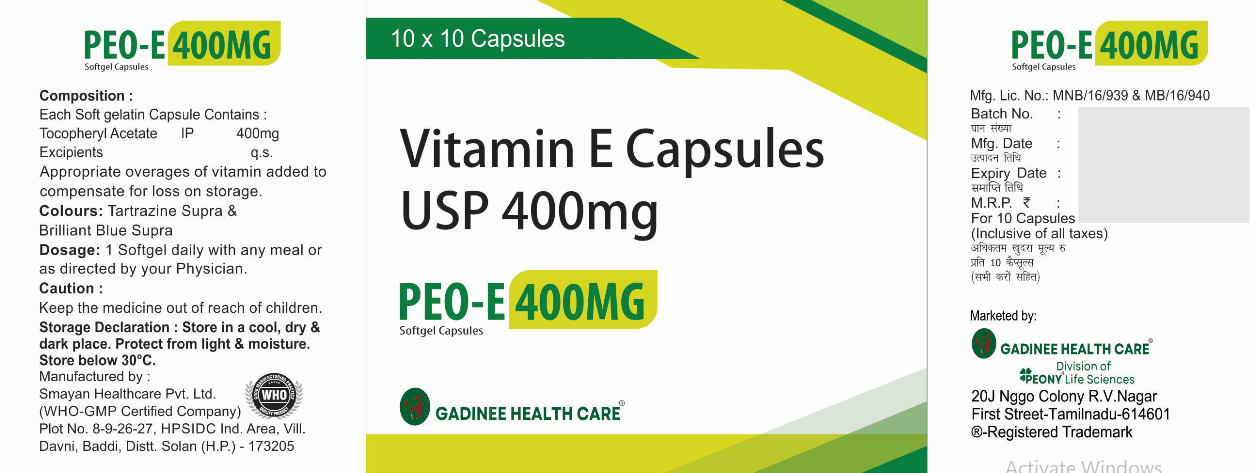 PEO-E 400mg is the primary form of vitamin E. This acetate is subsequently most commonly indicated for dietary supplementation in individuals who may demonstrate a genuine deficiency in vitamin E. Vitamin E itself is naturally found in various foods, added to others, or used in commercially available products as a dietary supplement.